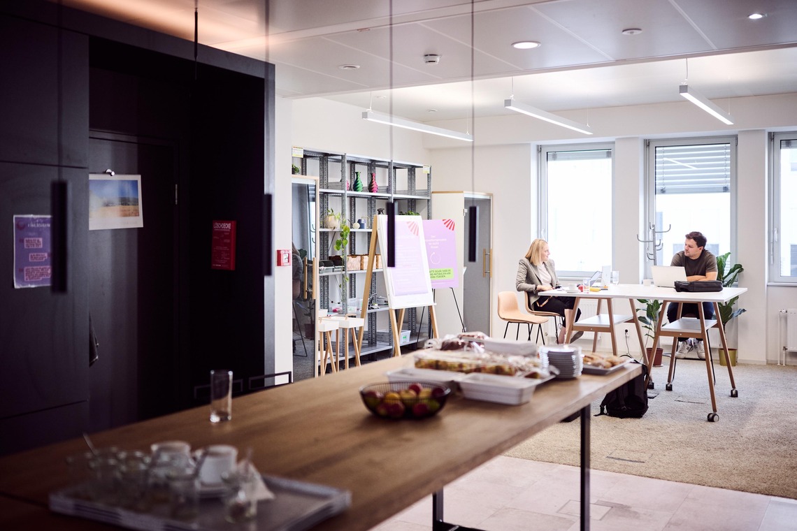 Darüber hinaus verfügt die Factory über einen Coworking-Bereich mit 20 Plätzen, in den sich kleine Startups und Gründer:innen einmieten können.